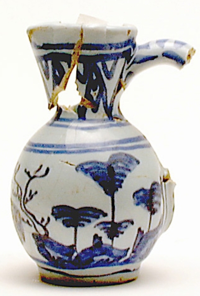 | 5c | uitwendig: buitenzijde hals en oor slordig geometrisch patroon, buik landschap met chinees persoon inwendig: blauw |