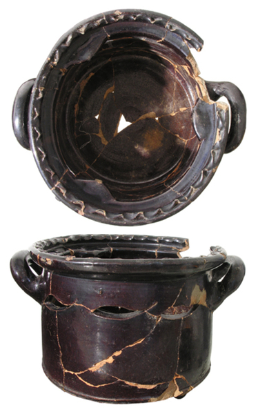 | 4b | wijd komfoor met scherpe knik bodem-wand, kraagrand met dekselgeul, luchtgaten in de wand, poten |