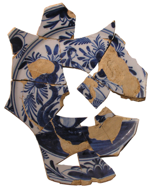 | 5c decoratie | blauw: sp: Chinese tuin met pauw, vl: gestileerd vegetaal motief, lotusbladeren, abrikozen blauw |