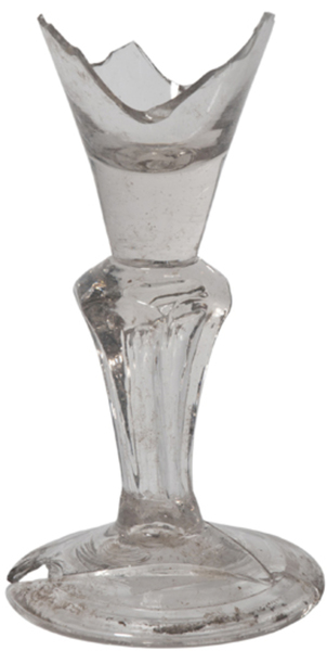 | 4b | trechtervormig kelkglas met dikwandige bodem veelzijdige stam van vijf of meer zijden met luchtbel, ook met diamanten op de schouders, voet met pontilmerk |