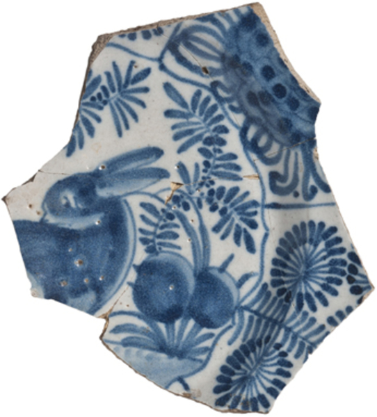 | 5c decoratie | op spiegel konijn omringd door planten, op vlag aan Chinees porselein ontleende vakverdeling met bloemen blauw |