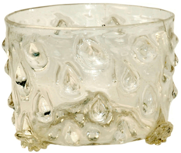 | 4b | cilindrische beker met knobbelpatroon of combinatie knobbel-netwerkpatroon, opgestoken bodem met pontilmerk, met noppootjes |