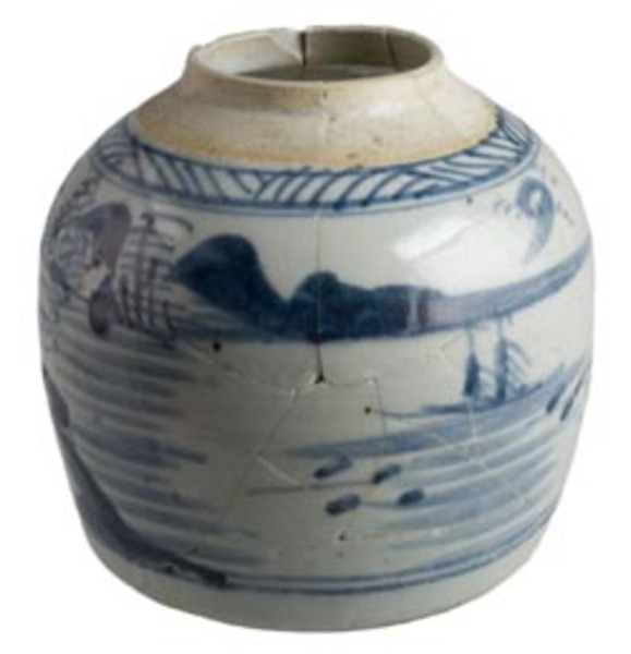 | 5c decoratie | uitw: landschap, rond hals servetwerk onderglazuur blauw |