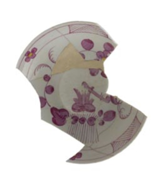 | 5c | inw.: onder rand filet met afwisselend driemaal een stukje servetwerk en een bloem met een geel hart, daaronder een guirlande van stilistische versiering en een bloem met een geel hart onderglazuur rood, bovenglazuur geel |