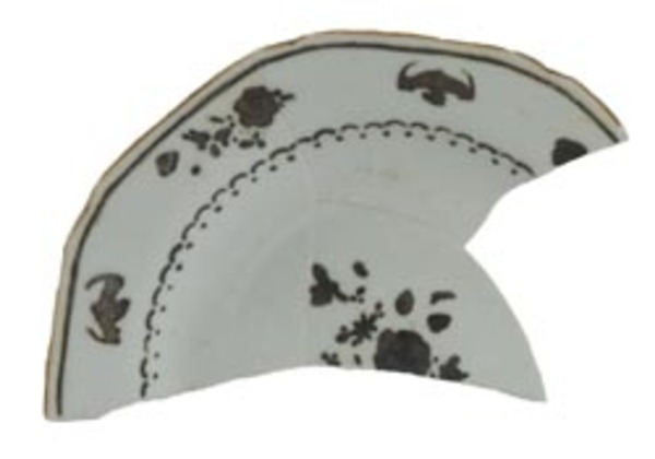 | 5c | inw, vlag: bruine rand, daaronder bloemengroepjes afgewisseld met soort vleermuis, sierrand op overgang naar spiegel, spiegel: bloemengroep onderglazuur bruin, bovenglazuur goud of groen (verkleurd tot zwart) |