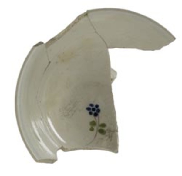 | 5c decoratie | variatie "vergeet-me-niet" in rood, blauw en groen; inw. op bodem en uitw: bloemen op gebouwd uit twee dunne lijnen met vier groene stippen als bladeren en een rozet van blauwe stippen als bloem, los daarvan groepjes van vier rode stippen polychroom |