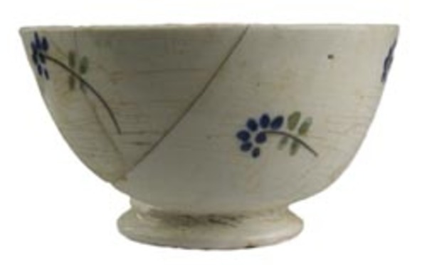 | 5c decoratie | variatie vergeet-me-niet; inw. op bodem en uitw: bloemen die zijn opgebouwd uit een steel met vier groene stippen als bladeren en een rozet van blauwe stippen als bloem polychroom |
