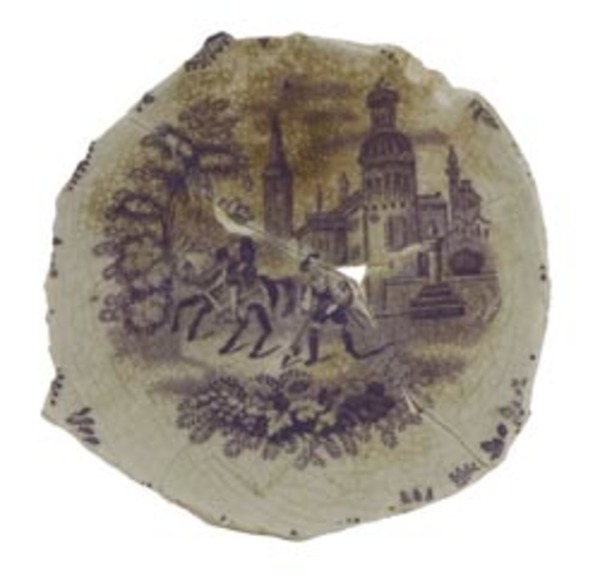| 5c | spiegel: ruiter te paard en lansier voor gebouw met veel torens vlag: ornamentrand paars |