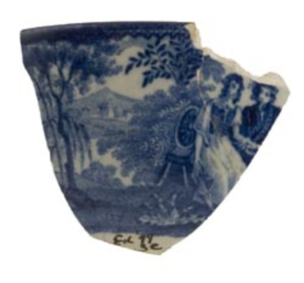 | 5c | uitw: gearmd paar, inw: ornamentrand, op bodem gearmd paar blauw |