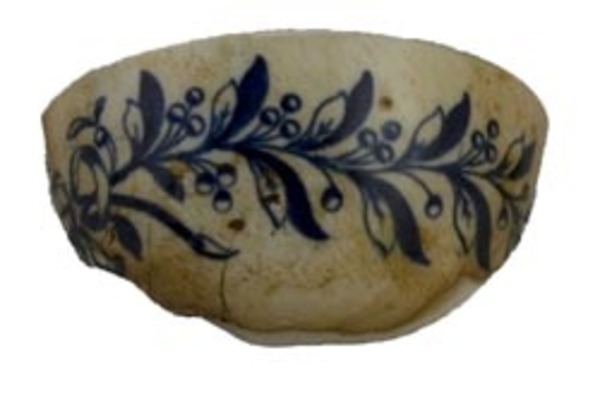 | 5c decoratie | uitw: doorlopende tak met blad en besjes, inw: geometrisch filet met diagonaal raster blauw |