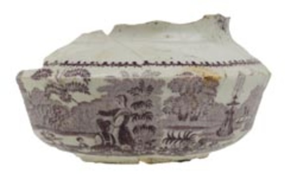 | 5c decoratie | uitw: twee vrouwen en een kind aan de rand van een vijver met twee zwanen paars |