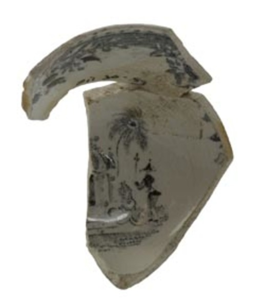 | 5c decoratie | uitw: oosters paleis met wachters in oosters landschap, inw: ornamentrand, op bodem: twee wachters met lans en punthoed zwart |