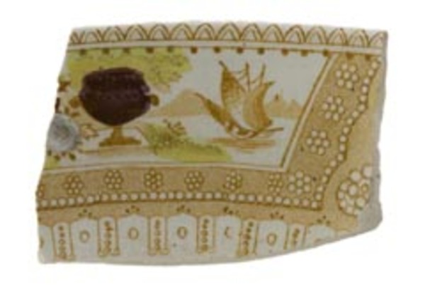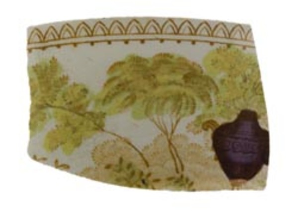 | 5c decoratie | uitw: in venster: tweemaster met boegspriet en ballonfok en grote vaas, inw: geometrische rand, detail bomen en grote vaas polychroom |