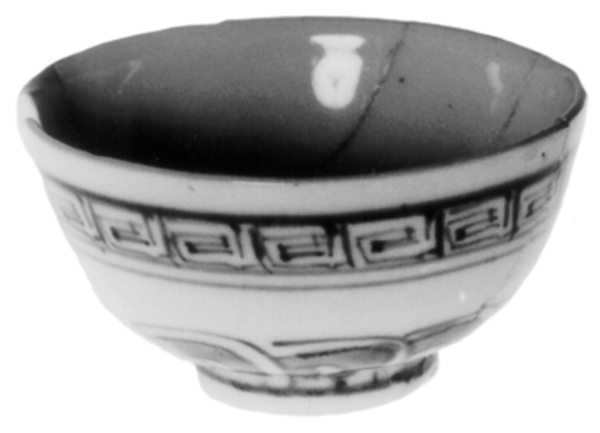 | 5c | uitwendig: onderglazuur blauw: rand: geometrische blokken, voet: bladeren, onderzijde: regeringsmerk uitwendig: blauw |