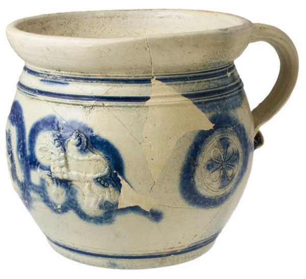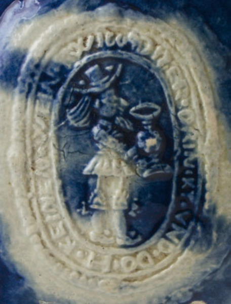| 5c decoratie | appliques: rozet, klauwende leeuwen, spreuk rond drinkebroer "(....ER) UND DRINKT UND DOCH KEINEN WEIN" blauw |