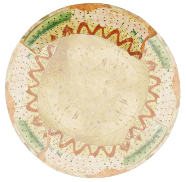 | 5c | witte slibdecoratie, vlakdekkend rode slib; ringeloor slingerlijn, groene slingerlijn, radstempel, witte ongeglazuurde rand |