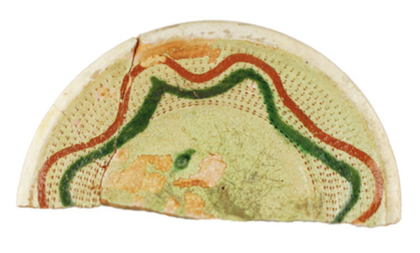 | 5c | witte slibdecoratie, vlakdekkend rode slib, ringeloor slingerlijn, groene slingerlijn, witte ongeglazuurde rand |
