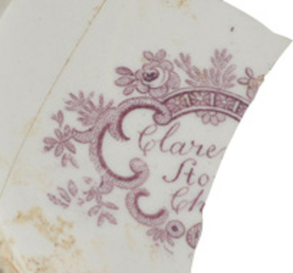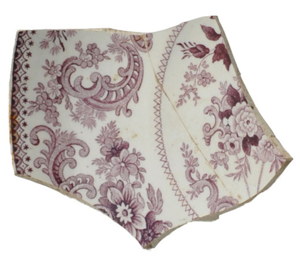| 5c decoratie | drukdecor, paars; inw: geometrisch bloemenpatroon onder de rand, op de spiegel hangmand met bloemen |
