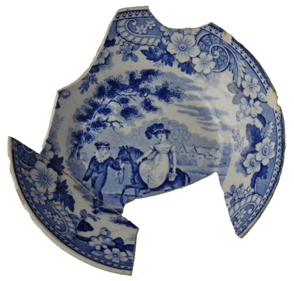 | 5c | drukdecor in blauw: DB opaque China; vlag: bloemen, spiegel: jongeman met een meisje op een paard blauw |