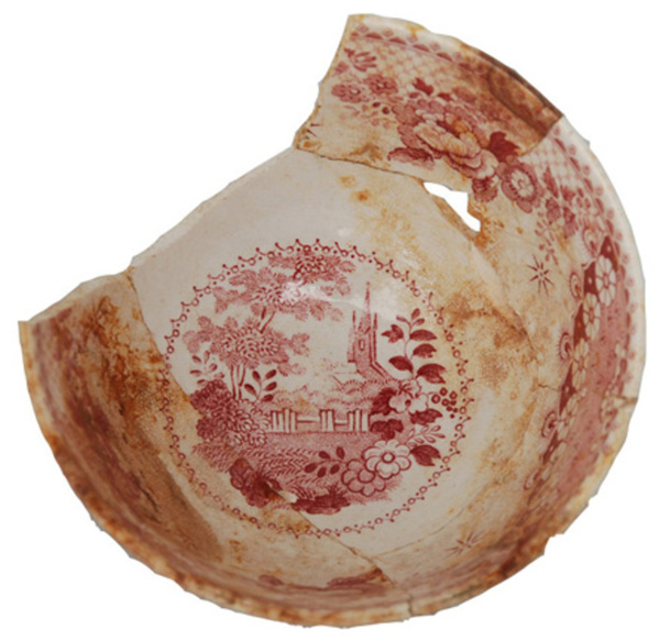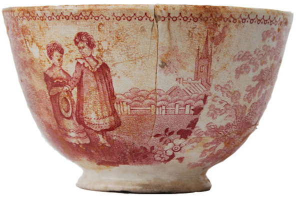 | 5c decoratie | inw: onder rand geometrische versiering, bodem kerk, dame en heer in een park met op de achtergrond een kerk rood |