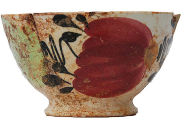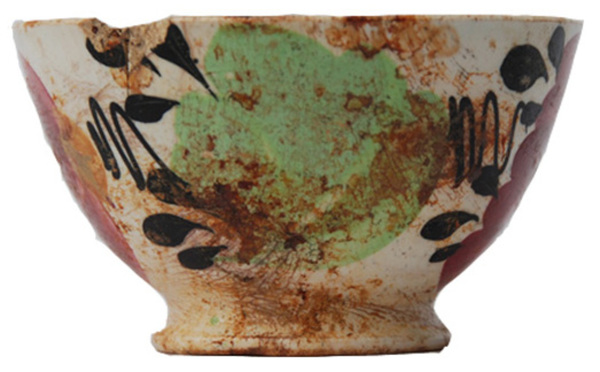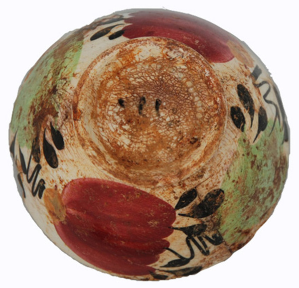 | 5c | inw: onder rand rood filet, uitw: twee groepen van bordeauxrode bloemen met geel hart gevolgd door zwarte blaadjes rondom een krultak, brede groene en zwarte blaadjes polychroom |
