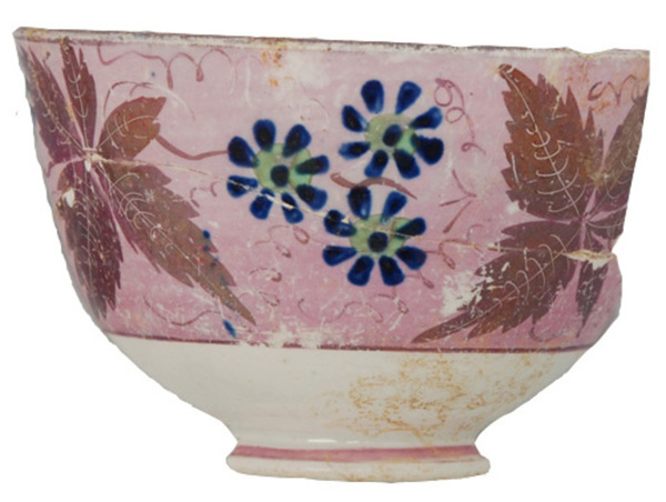 | 5c decoratie | inw: onder rand paars, parelmoer filet, uitw: druivenrankbladeren afgewisseld met bloemen rondom krullende takken |