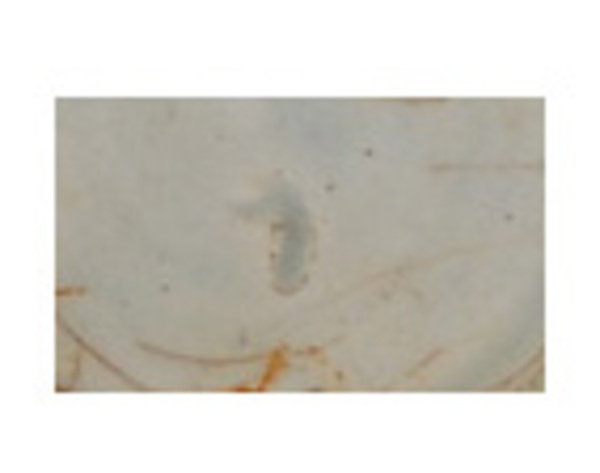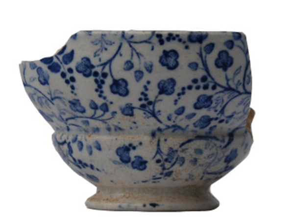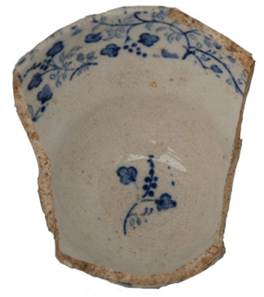 | 5c | drukdecor, inw: onder rand geometrische bloemversiering, bodem: bloem aan tak, uitw: bloemen aan takken blauw |