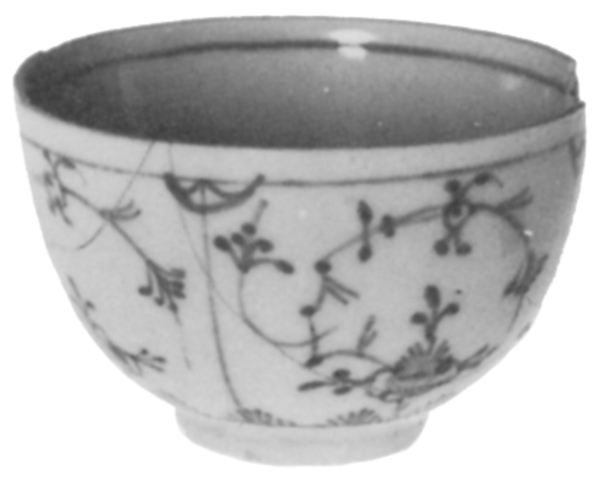 | 5c | inwendig: onderglazuur blauw: blauwe rand; bodem: bloem; uitwendig: onderglazuur blauw: gestyleerd bloemmotief inwendig: blauw; uitwendig: blauw |