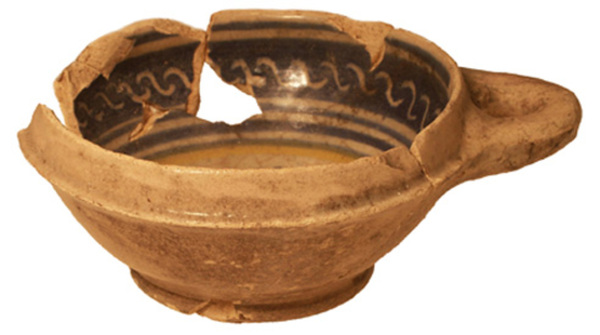 | 4b | kom met naar binnen gebogen rand met geprononceerde rand en verticaal worstoor, op standvoet |