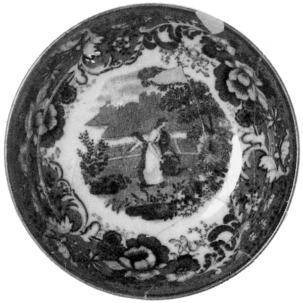 | 5c | inwendig: onderglazuur: drukdecor in blauw; vlak: bloemen; spiegel: tuinierende vrouwen inwendig: blauw |