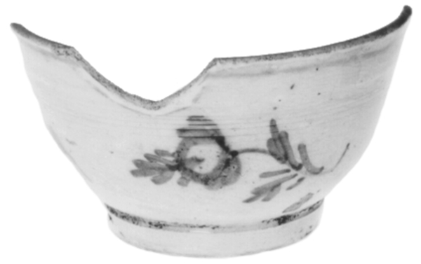 | 5c decoratie | uitwendig: onderglazuur: bloem in blauw, groen en paars uitwendig: blauw, groen en paars |