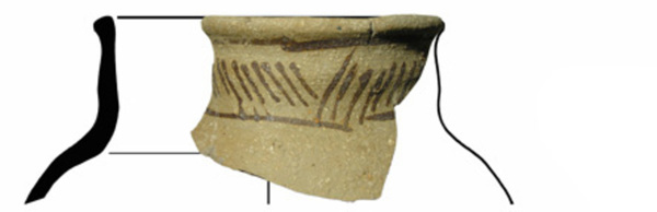 | 5c decoratie | rode verf: contra schuine streepjes binnen horizontale lijnen op hals |