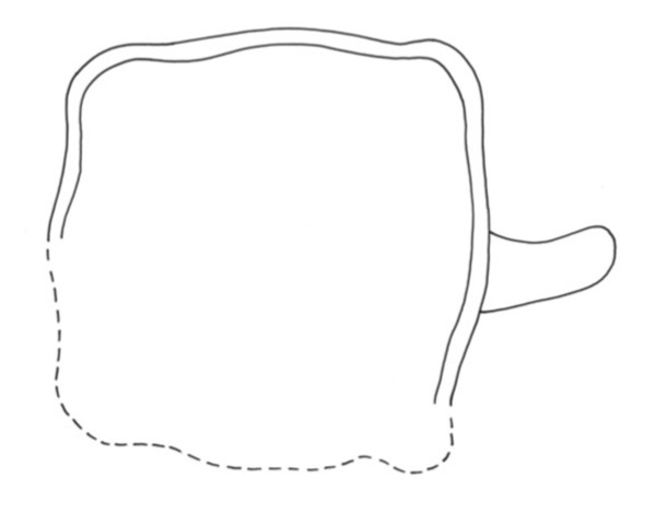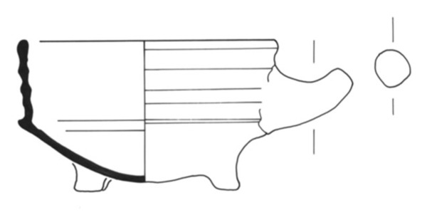 | 4b | vierkante vuurtest met scherpe knik bodem-wand en iets uitwijkende wand, afgeronde rand, poten |