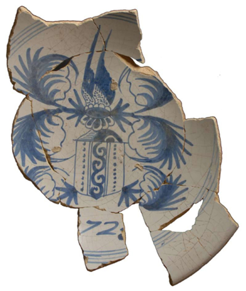 | 5c decoratie | blauwe beschildering: wapenschil met jaartal 172.. blauw |