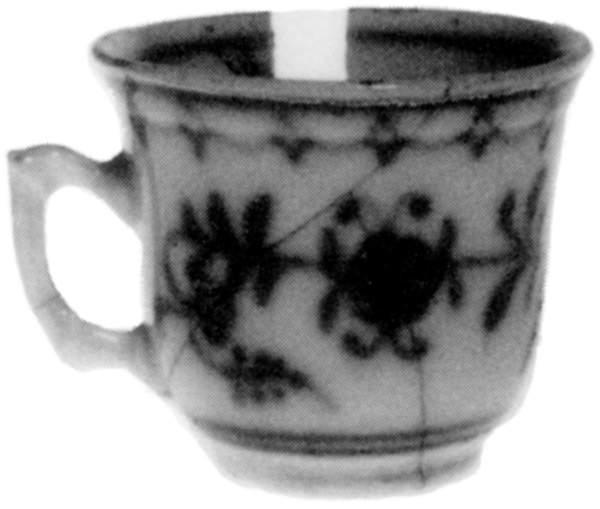 | 5c decoratie | inwendig: blauwe rand; uitwendig: onderglazuur blauw, bovenglazuur goud: vogel op tak inwendig: blauw; uitwendig: blauw en goud |