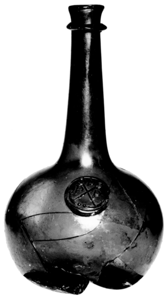 | 4b | bolvormige hoog kwalitatieve wijnfles, fleskaraf of fles met zeer lange hals, met ronde buik, ronde draad ruim onder om de lip, opgestoken bodem met pontilmerk |