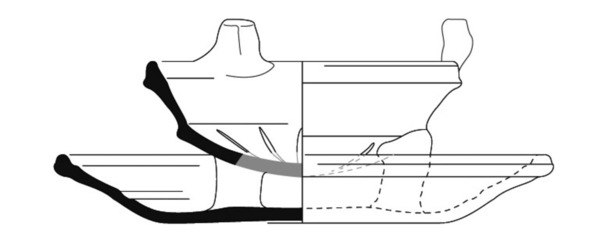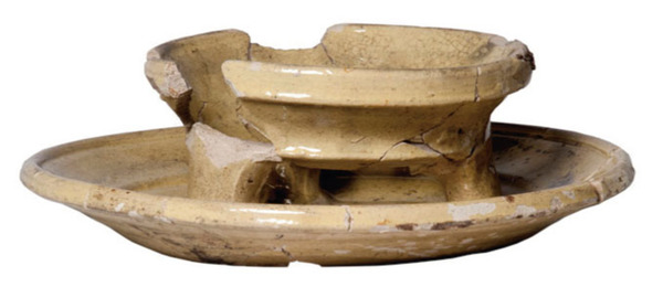 | 4b | komfoor met scherpe knik bodem-wand en driehoekig verdikte rand, op rand drie nokken (omgekeerde pootjes), snijwerk (luchtgaten) in bodem, aan onderzijde door drie nokken verbonden aan de onderschaal, standvlak |