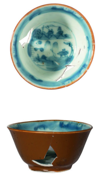 | 5c decoratie | landschap, ijzerrode glazuur op buitenzijde onderglazuur blauw, bruin |
