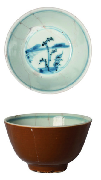 | 5c | rivierlandschap, ijzerrode glazuur op buitenzijde onderglazuur blauw, bruin |