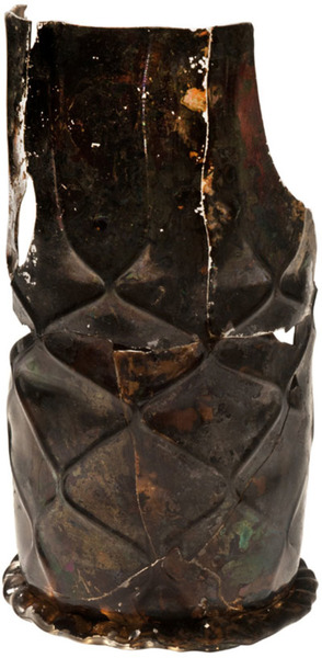 | 4b | cilindrische beker met netwerkpatroon in reliëf, opgestoken bodem met pontilmerk, voetring |