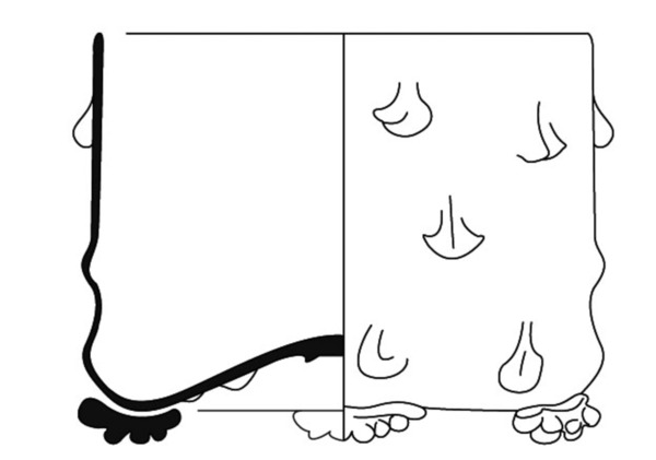 | 4b vorm | cilindrische beker met knobbelpatroon of combinatie knobbel-netwerkpatroon, opgestoken bodem met pontilmerk, met noppootjes |