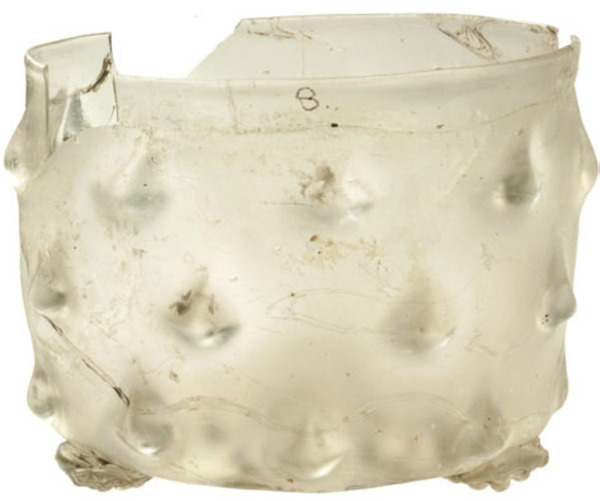 | 4b | cilindrische beker met knobbelpatroon of combinatie knobbel-netwerkpatroon, opgestoken bodem met pontilmerk, met noppootjes |