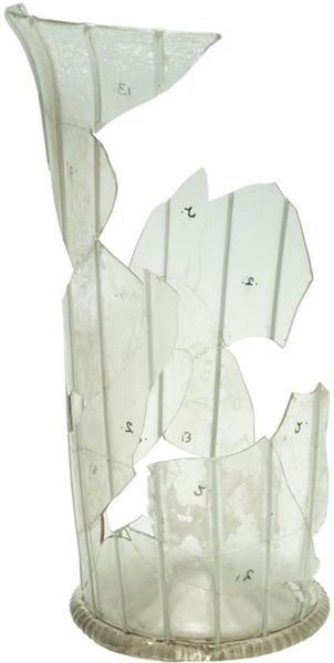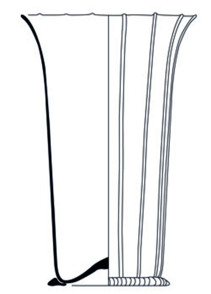 | 4b | cilindrische of lichtconische beker met uitstaande lip, met verticale of diagonale draden of ribben, opgestoken bodem met pontilmerk, voetring |