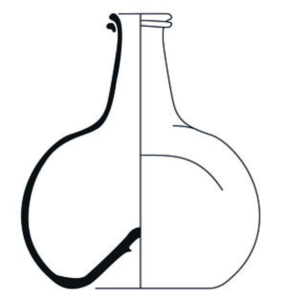 | 4b | bolvormige wijnfles met tweezijdig afgeplatte buik, opgestoken bodem met pontilmerk |