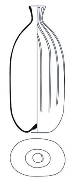 | 4b | gerekt buidelvormig tweezijdig afgeplatte fles met korte cilindrische of conische hals, verticale ribben, opgestoken bodem met pontilmerk |