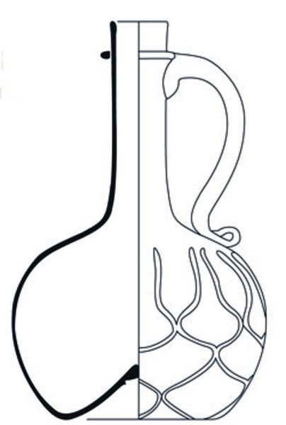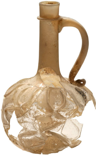 | 4b | bolvormige fles met lange smalle cillindrische hals met draad ruim onder rechte lip, netwerkversiering in reliëf, oor, opgestoken bodem |