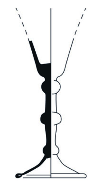 | 4b | klok- of trechtervormig kelkglas met dikwandige bodem, holle of (deels) massieve stam met drie geledingen met nodus of paddestoelvormige nodus met luchtbel, voet met pontilmerk |