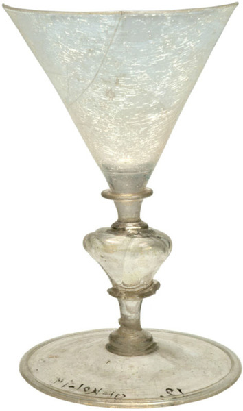 | 4b | trechtervormig kelkglas met of zonder afgeronde of dikwandige bodem, met vierlobbige holle nodus- of balusterstam, met één of meer schijfjes, schijfvormige voet met pontilmerk |