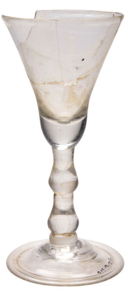 | 4b | conisch kelkglas met afgeronde dikwandige bodem, massieve balusterstam, ook met luchtbel, ook met ribben-relëf, schijfvormige voet met pontilmerk |