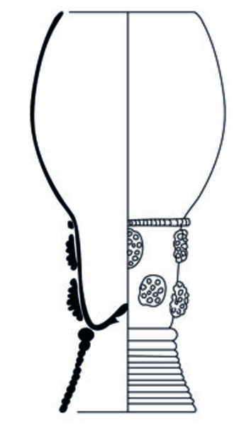 | 4b vorm | roemer met ei- of tonvormige cuppa, geribde draad op de overgang naar de schacht en één of meer verspringende rijen braamnoppen, opgestoken bodem met pontilmerk, gewonden draadvoet |